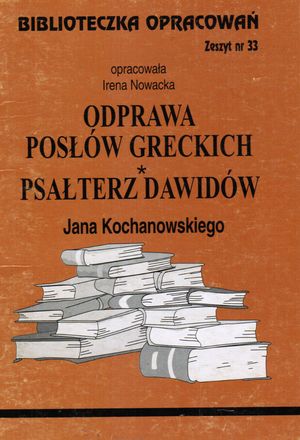 Biblioteczka Opracowań to seria wydawnicza prezentująca omówienia problemowe lektur szkolnych, adresowane do uczniów i nauczycieli szkół średnich i podstawowych. Pozwala na lepsze zrozumienie utworów literackich, dostrzeżenie walorów artystycznych, jest też wygodną pomocą w powtarzaniu wiadomości przed maturą. Opracowania powstały we współpracy historyków literatury i nauczycieli języka polskiego. Niniejsze opracowanie analizuje wnikliwie treść i sens najsłynniejszego dramatu polskiego renesansu - "Odprawy posłów greckich" Jana Kochanowskiego oraz tłumaczenia "Psałterza Dawidów". W opracowaniu znajdują się: informacje o epoce i notka biograficzna autora, poglądy filozoficzne Kochanowskiego, omówienie problematyki dramatu i propozycji translatorskiej psałterza. [ze wstępu]