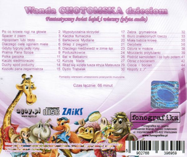 Wanda Chotomska dzieciom / Wanda Chotomska. - Warszawa : Wydawnictwo "Nasza Księgarnia", cop. 2013. - 1 płyta (CD) (66 min) : digital, stereo. ; 12 cm.